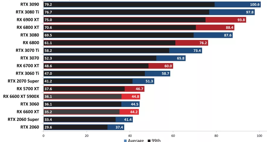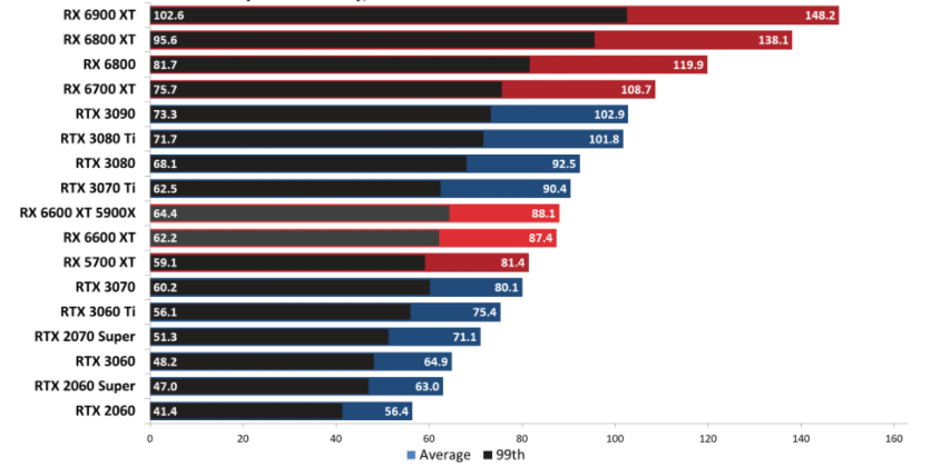 또한 RX 5700 XT가 7.1% 앞서며 선두를 달리고 있으며, GPU가 빨라지면서 RX 6700 XT가 37%, RX 6800이 74%, RTX 3060 Ti가 RX 6600 XT보다 34% 더 빨랐습니다.
