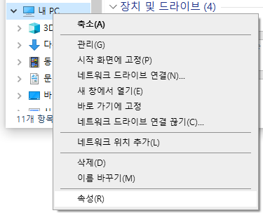 먼저 윈도우창에서 내 PC를 선택하고 우클릭 -> 속성을 누릅니다.