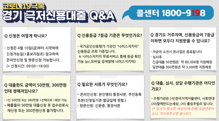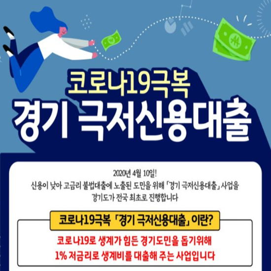 그래서 2020년 4월 10일부터 신용이 낮아 고금리 불법 대출에 노출된 도민을 위해 "경기 극저신용대출" 사업을 경기도가 전국 최초로 시행합니다.