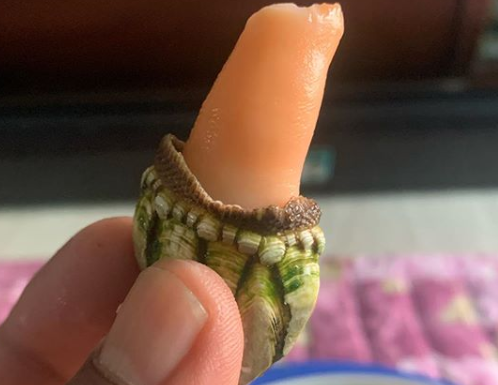 삶은 거북손을 식히고, 먹을 수 있을 정도로 식었다면 검은 부분에 끝 부분을 꺽으면 "툭" 소리와 함께 속살을 꺼내실 수 있어요.