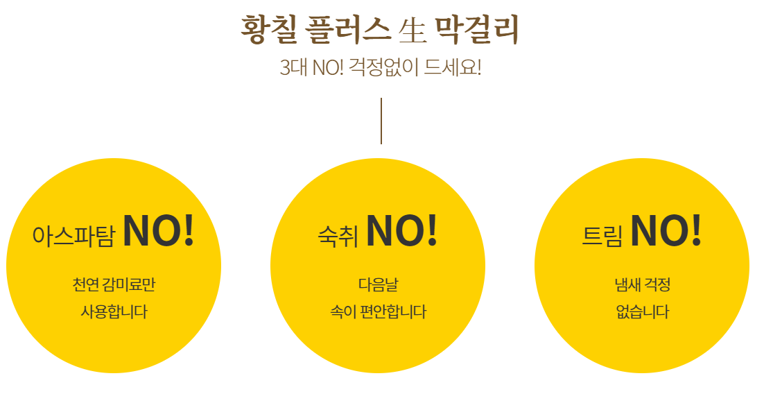 황칠, 벌꿀, 천연감미료를 넣은 건강막걸리로, 아스파탐을 넣지 않아서 숙취와 트림이 없어 부담 없이 마시기 좋다고 합니다.